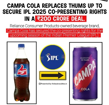 Campa Cola takes over! 🏏🔥 In a game-changing ₹200 crore deal, Campa Cola replaces Thums Up as the co-presenting sponsor of IPL 2025!💰🏆 This marks a bold comeback for the iconic desi cola, shaking up the soft drink wars on the biggest cricket sta