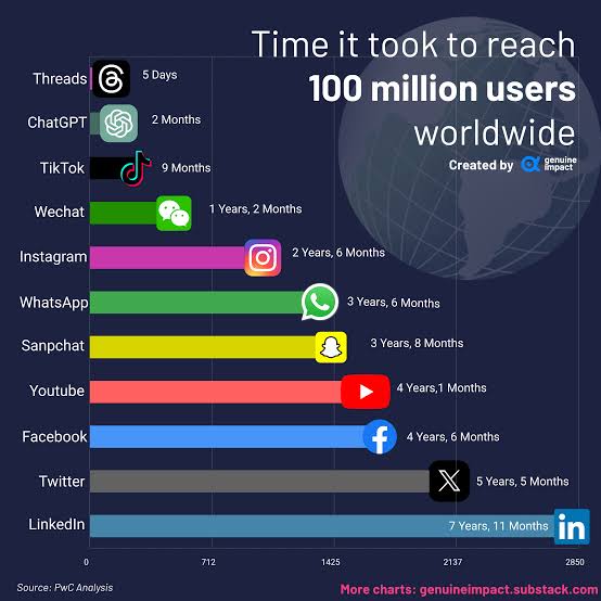 Threads took only 5 days to get 100 million users, ChatGPT took 2 months
