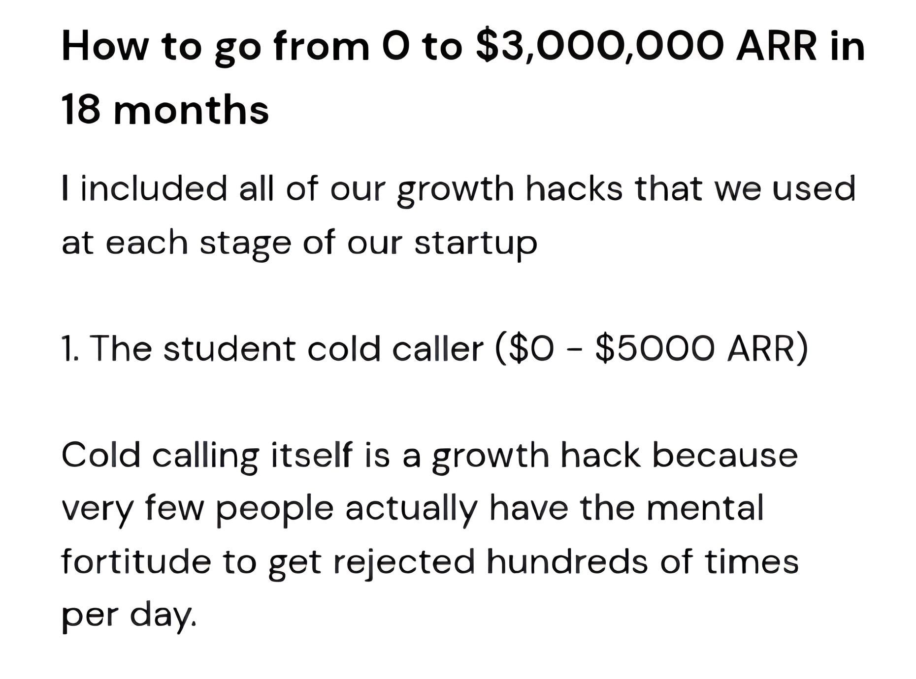 This guy built a startup from $0 to $3M ARR in just 18 months, and his journey was all about experimenting, adapting, and doubling down on what worked. Here’s how he did it: 1. Cold Calling Like a Student ($0 - $5K ARR) He started with cold calling