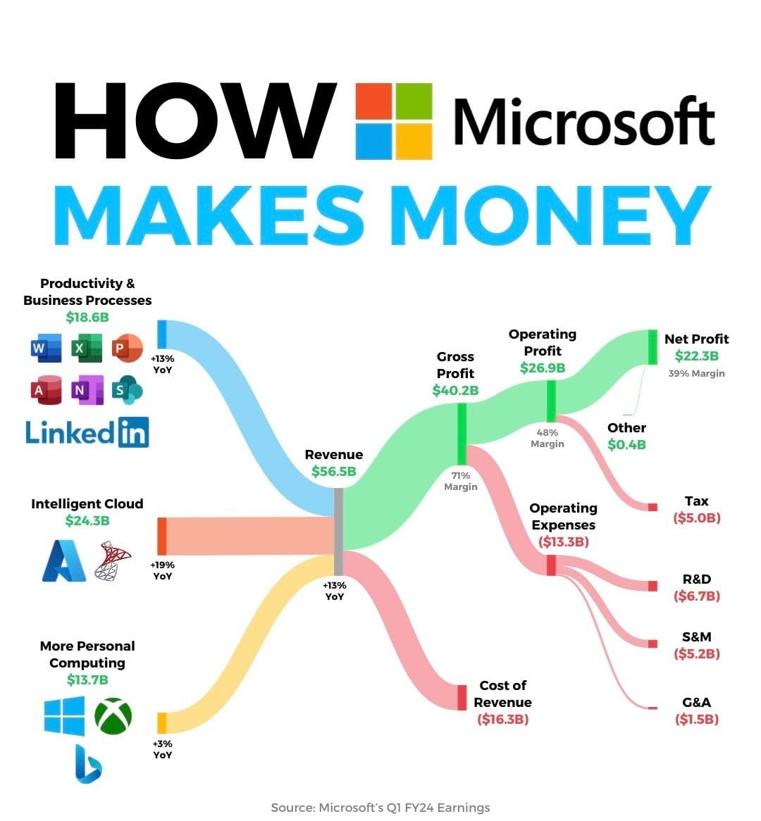 "Ever wondered how🚀 Microsoft makes its 💰💰money? Here's a breakdown from their Q1 FY24 earnings. With $56.5 billion in revenue, the key areas driving growth are Productivity & Business Processes, Intelligent Cloud, and More Personal Computing. The