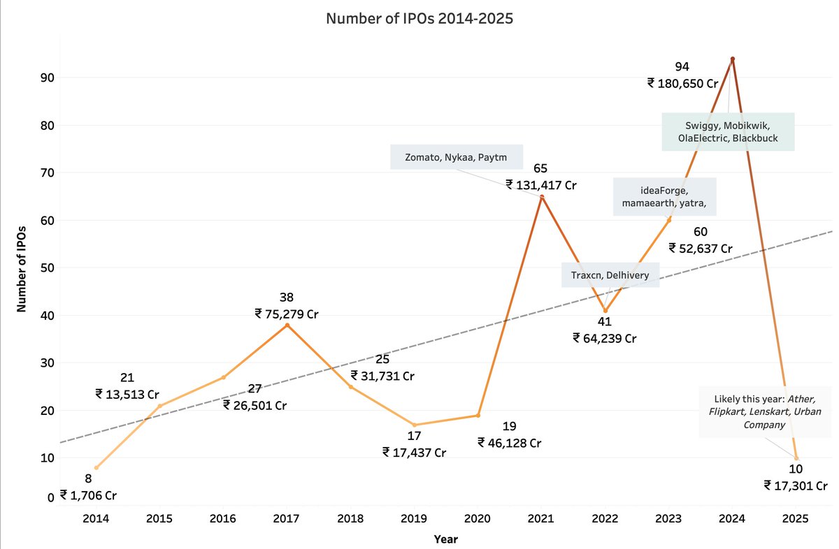 2024 - saw a surge in India's IPO market with startups like Swiggy, Ola Electric and Blackbuck going public. 13 Startups raised→ ~₹29,000 Cr, as per Avendus. Accel's founding partner Mr. Prashanth Prakash predicts another strong year → 70-100 IPOs (SME + mainboard) expected in 2025. Domestic investor participation has grown to ~15% (prev. 3-5%), and Family Office participation has tripled. 🗓️Ather, Flipkart, Lenskart, Urban Company and others are likely to go public this year. I put together a chart tracking India's mainboard IPOs over the years(mainboard : minimum paid-up capital of ₹10 crores) ⤵️