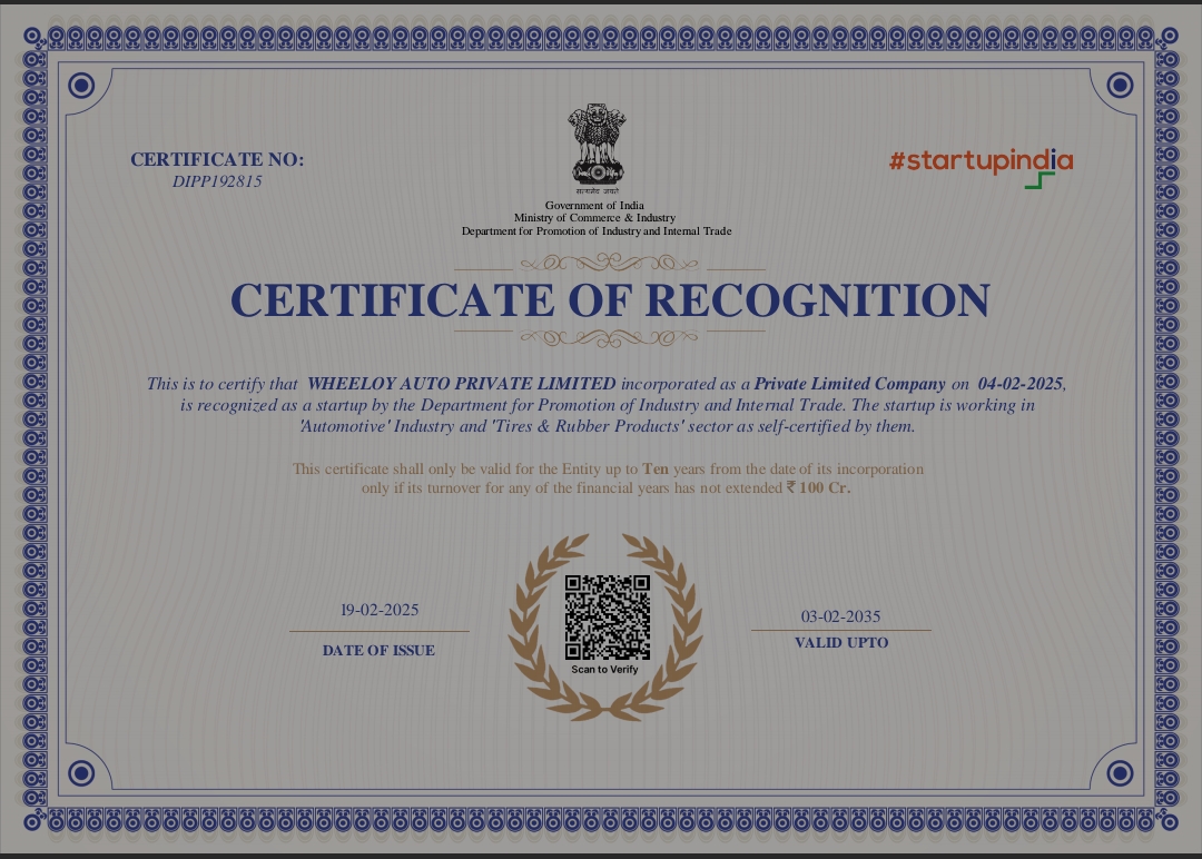 Excited to share that Wheeloy is now officially recognized by DPIIT! A big milestone for us! 🚀
