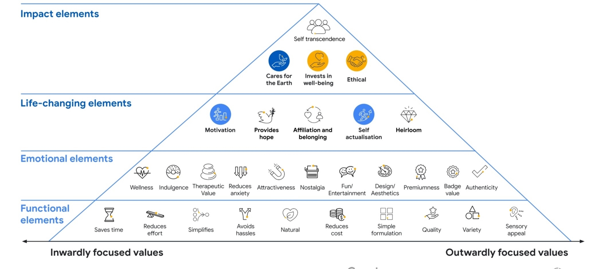 VALUES over VALUE Modern consumers, especially the younger generation, are gravitating towards brands that align with their value systems, focusing on social impact, sustainability, and wellness. Look at this- The Elements of Value pyramid highligh