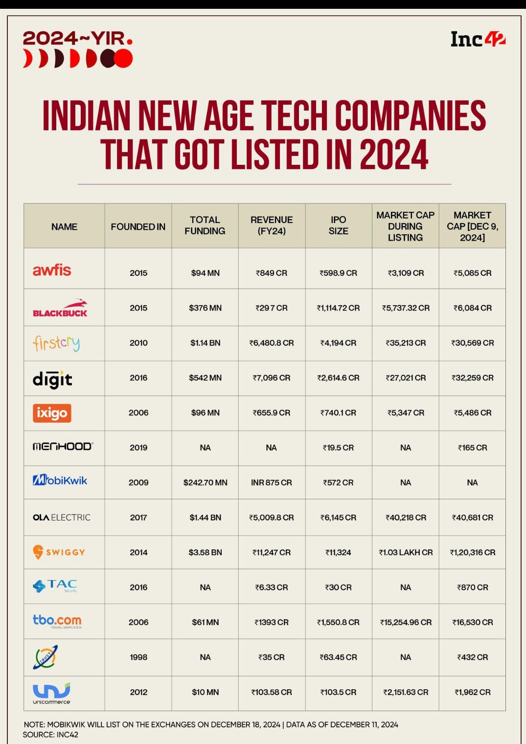 2024: The Year of Indian IPOs โข In 2024, 13 Indian startups went public and made over Rs 29,000 crore ($3.4 billion). โข These included Swiggy, Mobikwik, Ola Electric, FirstCry, Ixigo, and Unicommerce. Swiggy did well, Mobikwik was popular, and Ola
