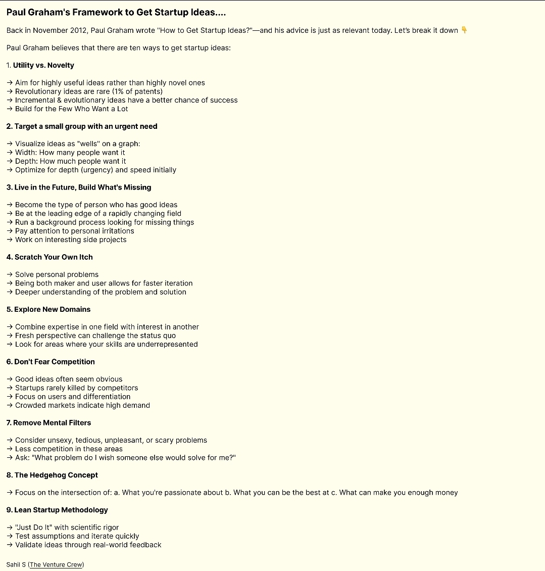 Paul Graham’s Timeless Framework for Finding Startup Ideas. Back in 2012, Paul Graham wrote the now-classic "How to Get Startup Ideas". Over a decade later, it’s still one of the most important essays for any founder trying to build something real.