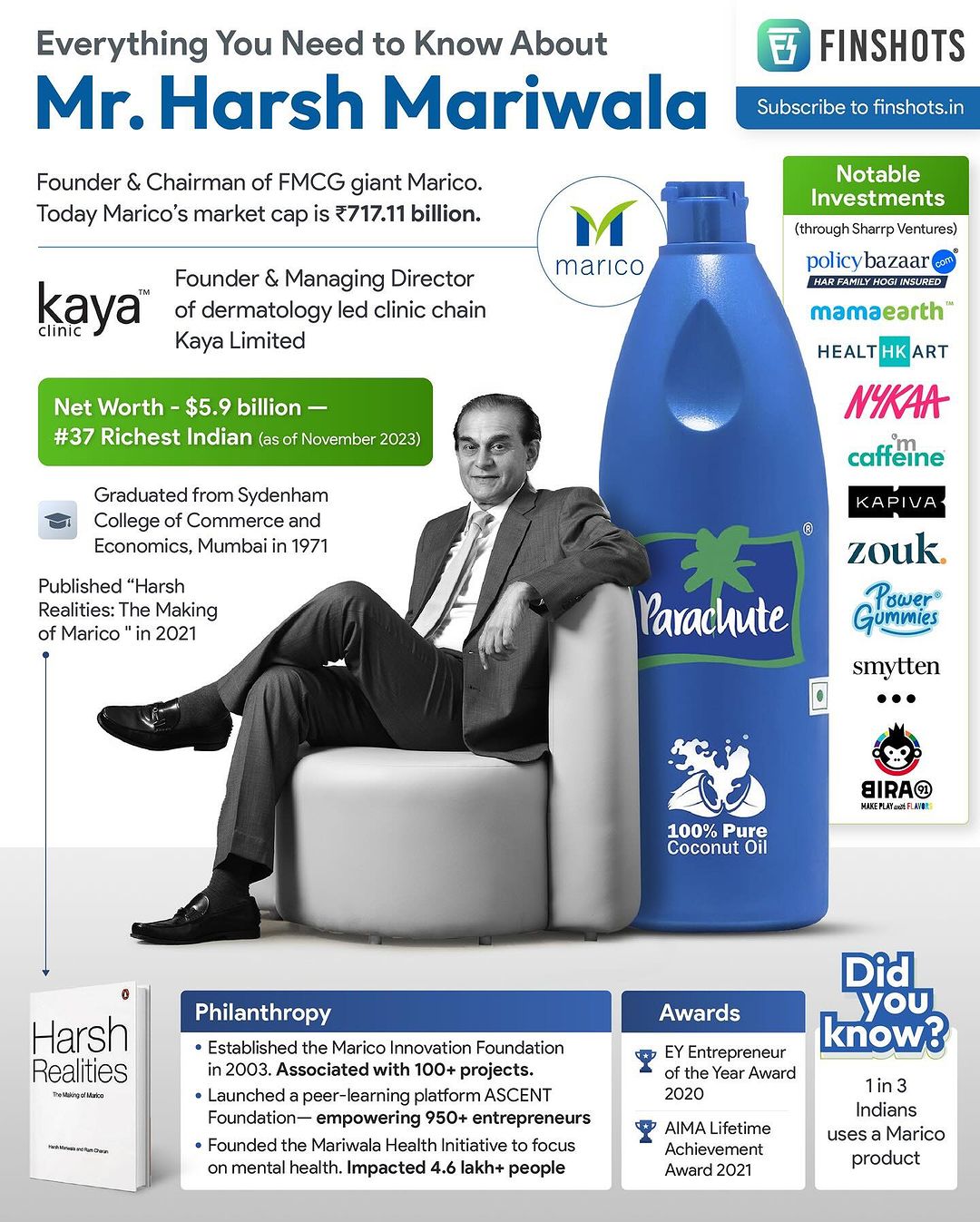 Harsh Mariwala is the founder of Marico 📈 one of India's leading consumer goods companies. Born into a business family, Mariwala joined the family-owned Bombay Oil Industries in the early 1970s. He saw the potential in branded consumer products an