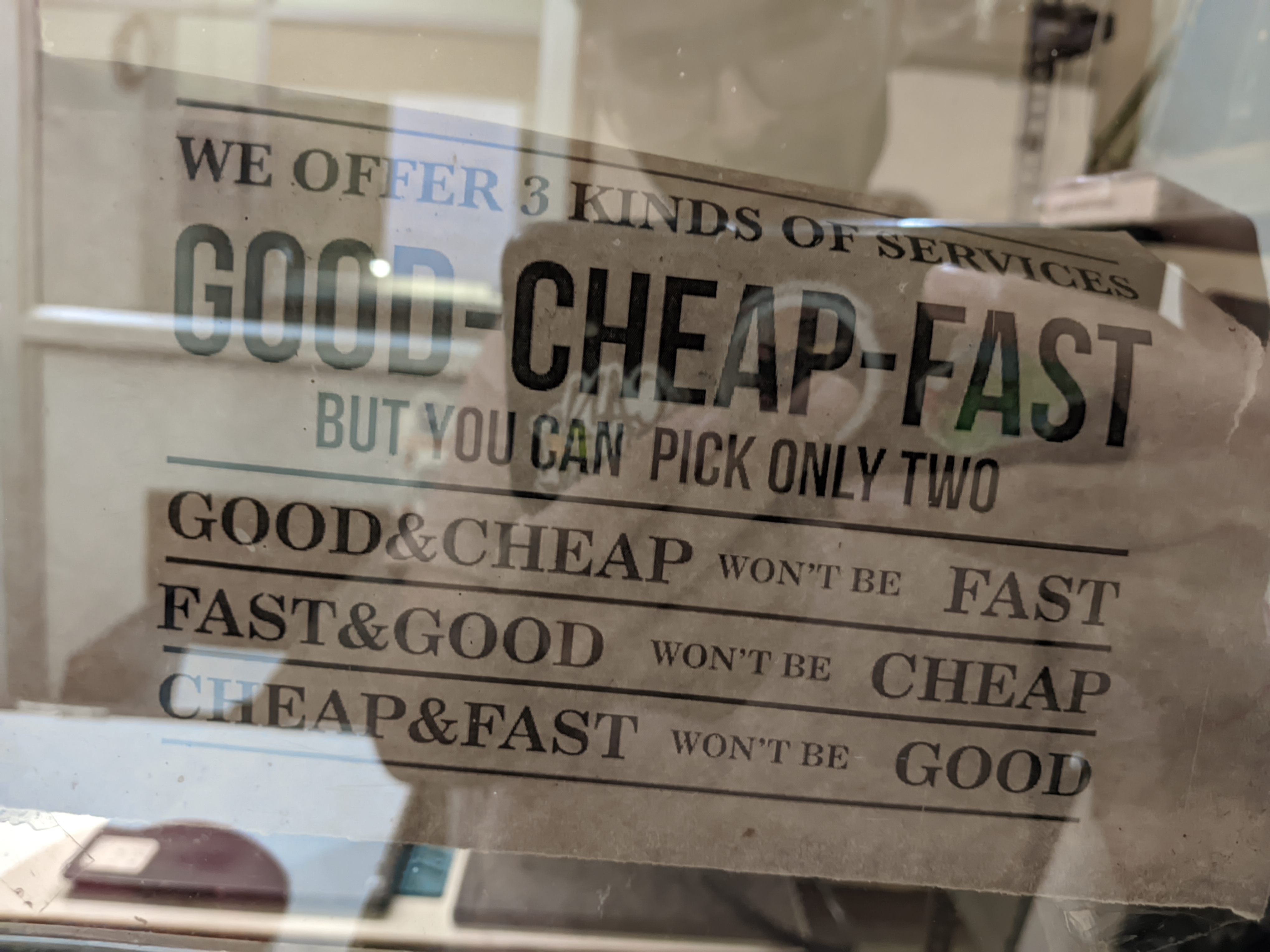 Client: “We need this app to be FAST.” Us: “Okay.” Client: “And CHEAP.” Us: “Hmm…” Client: “And TOP QUALITY.” Us: nervous laugh Welcome to the holy trinity of software: Fast Cheap Good Pick two. We don’t make the rules — we just code around the