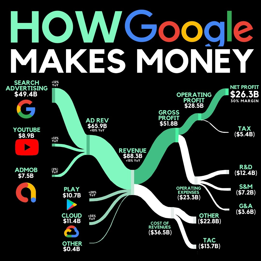 Google’s business is the ultimate middleman model – connecting businesses and creators while taking a hefty share. 💰 $88.3B revenue 🔹 $65.9B from ads (Search, YouTube, AdMob) Most of their revenue comes from ad dollars, bridging creators & advert