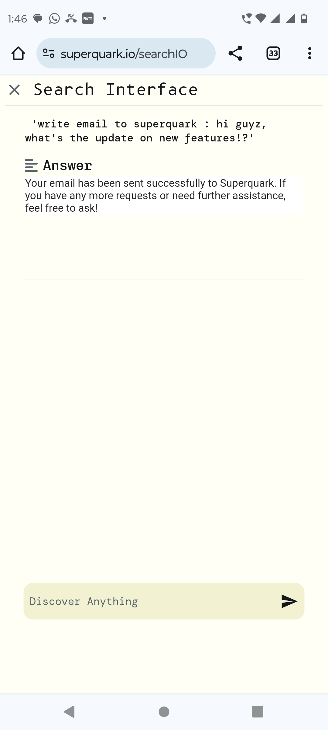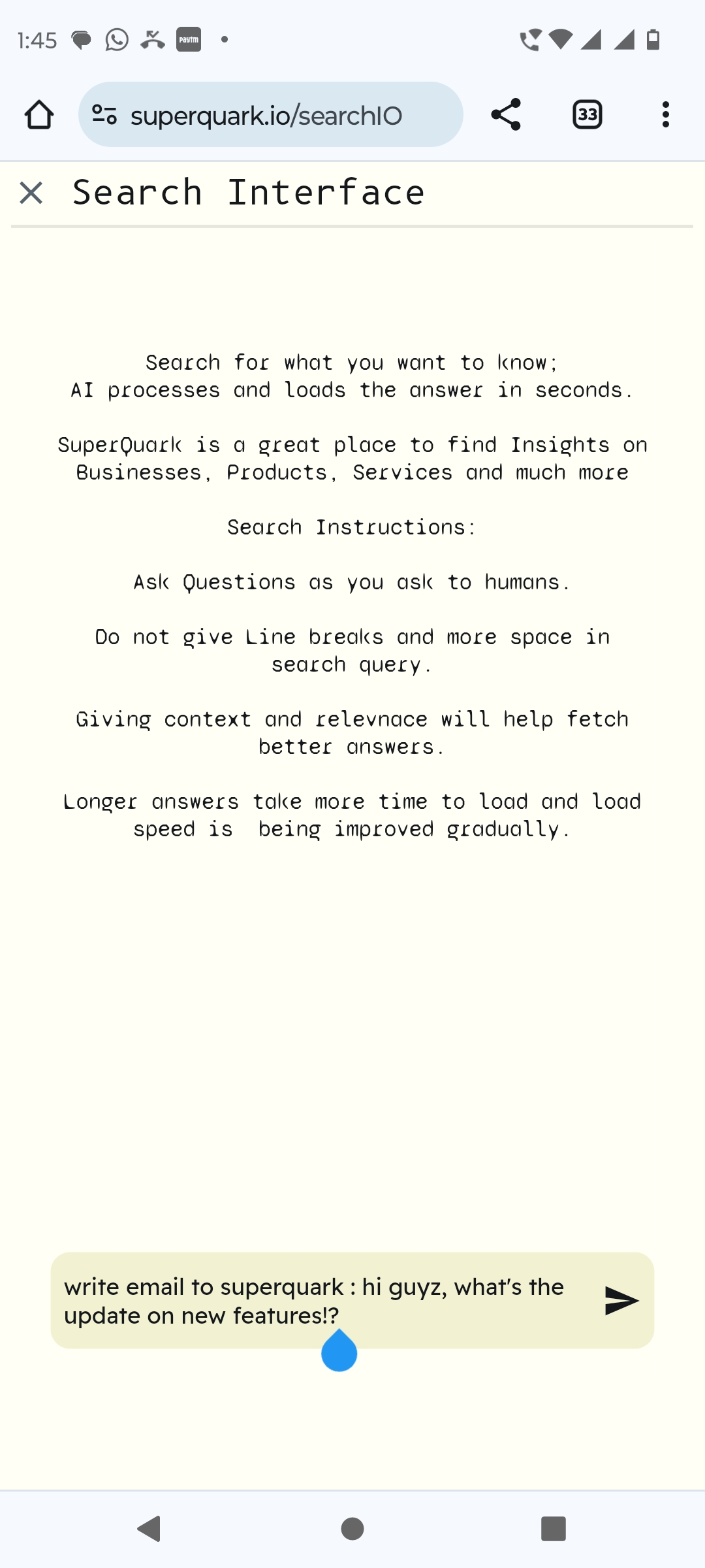 When u type 'write email to superquark' followed by ur message to us and hit enter. Now that message of yours reaches us via email. We have introduced this feature to ease the user connectivity to ourselves and to demonstrate the growing AI capabili