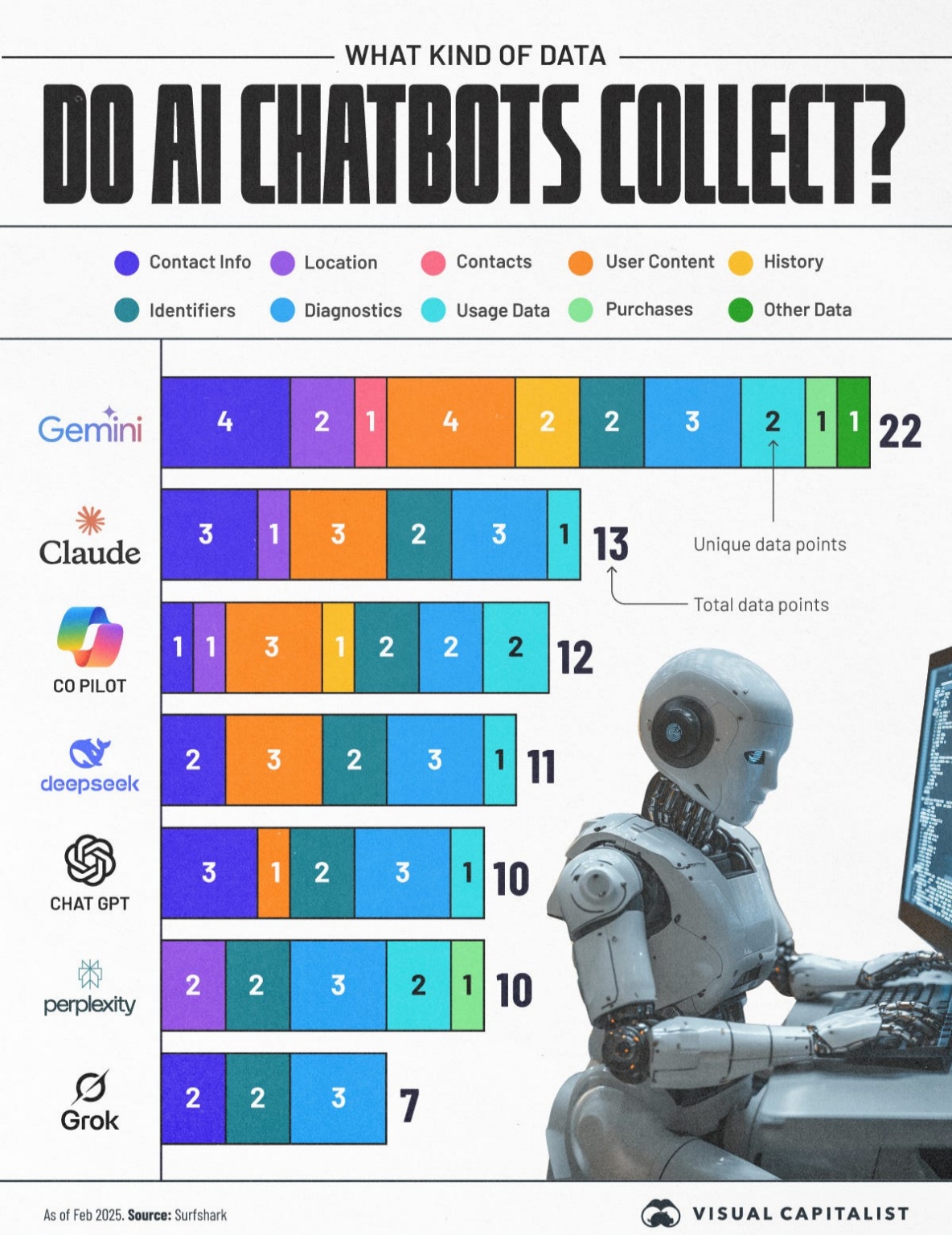 Which AI Chatbots Collect the Most Data? Based on Surfshark's Feb 2025 report: โ Googleโs Gemini collects the most: 22 data points across 10 categories (even your contacts) โ xAIโs Grok collects the least (only 7 data points) โ ChatGPT is the mos