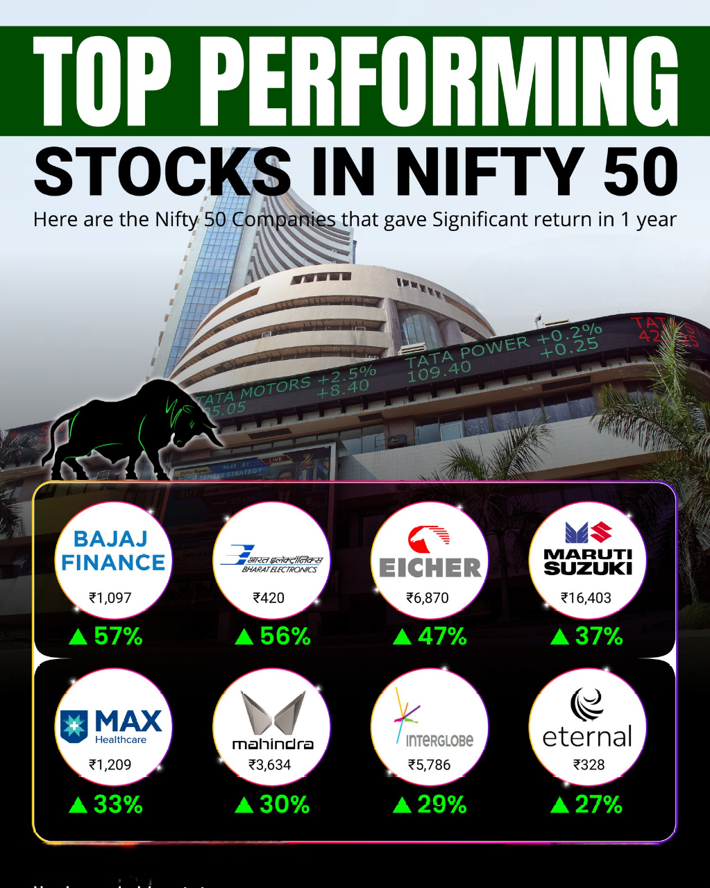 TOP PERFORMING STOCKS IN NIFTY 50! ๐ฅ These are the companies that delivered massive returns in just 1 year! ๐ From Bajaj Finance to Eicher Motors, the bulls are roaring loud in the market! ๐๐น ๐ฐ Whoโs your favorite pick for the next rally? ๐ Com