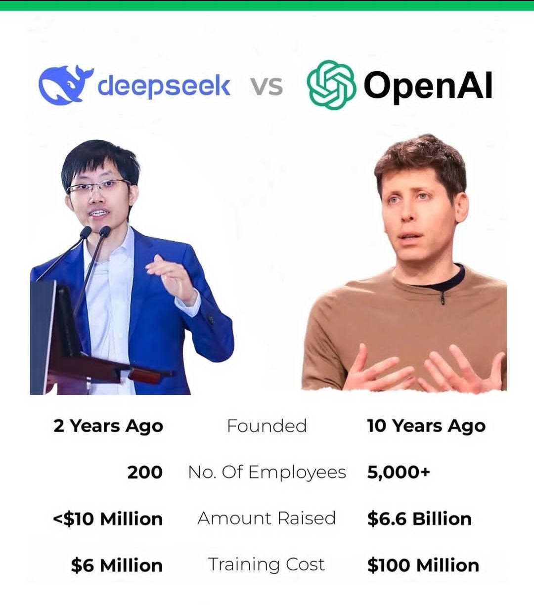 𝗗𝗮𝘃𝗶𝗱 𝘃𝘀. 𝗚𝗼𝗹𝗶𝗮𝘁𝗵 𝗶𝗻 𝗔𝗜? ⚔️ Deepseek, a relatively new player in the AI space, is taking on OpenAI with just a fraction of the resources! 🚀 🔹 Deepseek (Founded 2 years ago) 👨💻 Employees: 200 💰 Funds Raised: <$10M 🖥️ Training Cost: $6M 🔹 OpenAI (Founded 10 years ago) 👨💻 Employees: 5,000+ 💰 Funds Raised: $6.6B 🖥️ Training Cost: $100M Despite the massive difference in funding and scale, Deepseek is making waves in the AI ecosystem. Could this be the next major disruptor? 🌊 What do you think—can agility and innovation beat sheer financial muscle? 🤔 Let’s discuss!