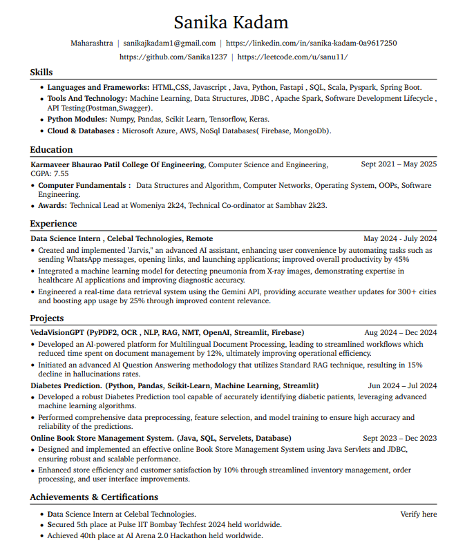 Hi everyone, I am Sanika Kadam , I am an aspiring Software Engineer 2025 Batch passout. I am looking for open roles as a Software Engineer(Java/Python), Data Scientist. If anyone has any opportunity for me kindly DM with the opportunity. Please find