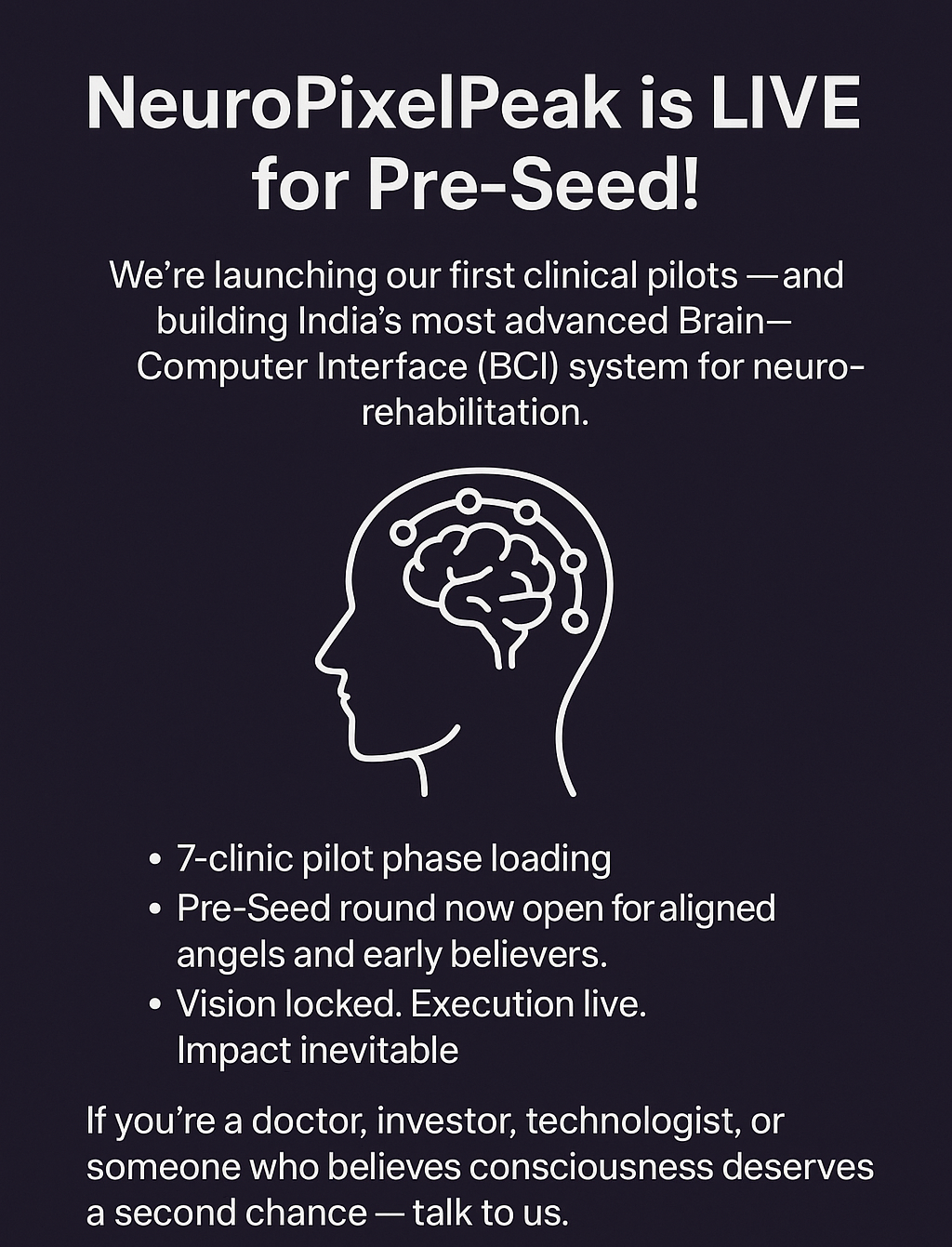 🚀 NeuroPixelPeak is officially LIVE for Pre-Seed from 15 AUG 2025 We’re launching our first clinical pilots — and building India's most advanced Brain-Computer Interface (BCI) system for neuro-rehabilitation. 🧠 Our system lets paralyzed patients i