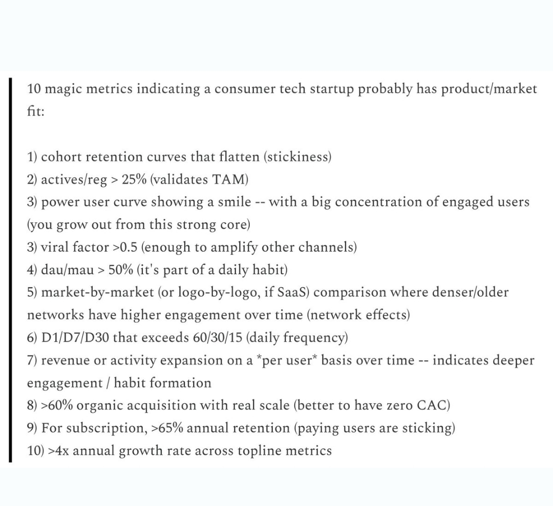 actually it's not that hard. 1) Cohort Retention is a term used in data analytics. for eg, if we select a cohort of all those users who signed up on Medial on sunday, we will use data to see what % of those users open Medial the next day, etc. a flat curve shows that users are consistent. 2) if 100 people sign up on a platform, and over 25 users are using it again, this helps use calculate precise total addressable market 3a) users praising a product. nothing else 3b) No idea 4) if daily active users are more than 50% of monthly active users. that means the users are consistent and its an habit for them 5) no idwa 6) part of the cohort i said about in first point. It shows that for example if on day 0, 100 users open Medial, then day 1, atleast 60 users should openai and so on. 7) an average users spending more time or spending more on a service. like in start we spent less on QCom, but now it's increasing, etc 8) more than 60% users should be aquired organically (ie word of mouth, good seo, etc) 9)65% users should keep their subscriptions active. subs for a Netflix, medial Premium, or YouTube, etc 10) Revenue growing by 400% every year. (that's really tough)