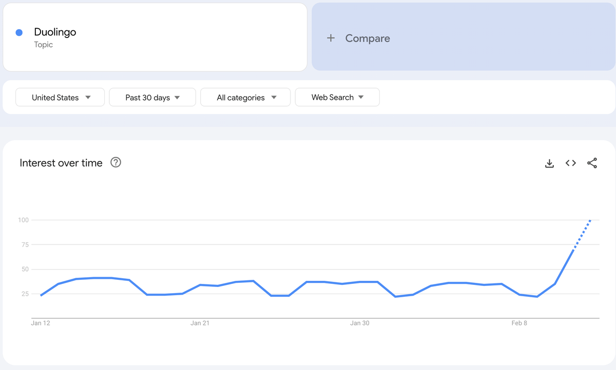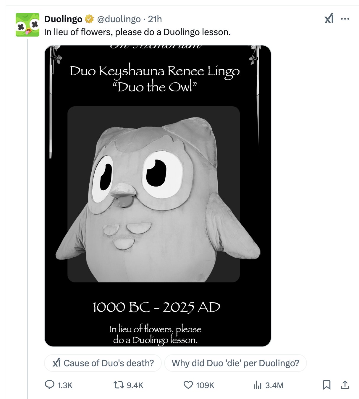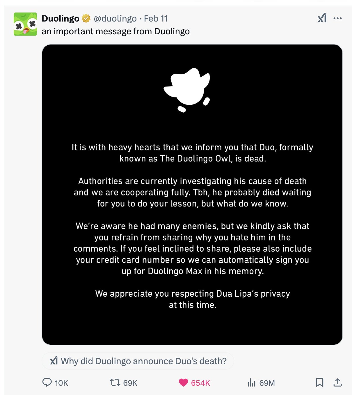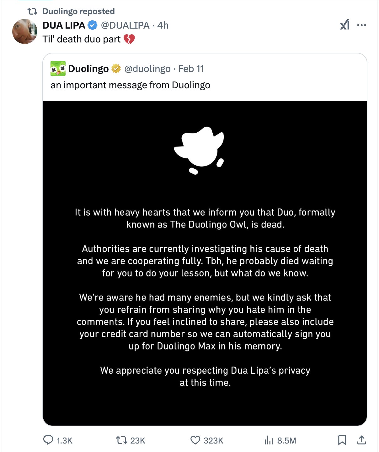 > be Duolingo > post tweet saying your mascot died > mention Dua Lipa at the end (they sound similar) > get 69M views on statement > get a Dua Lipa quote-tweet > big brands like Netflix and Halo quote-tweet > search interest hits all-time high > post