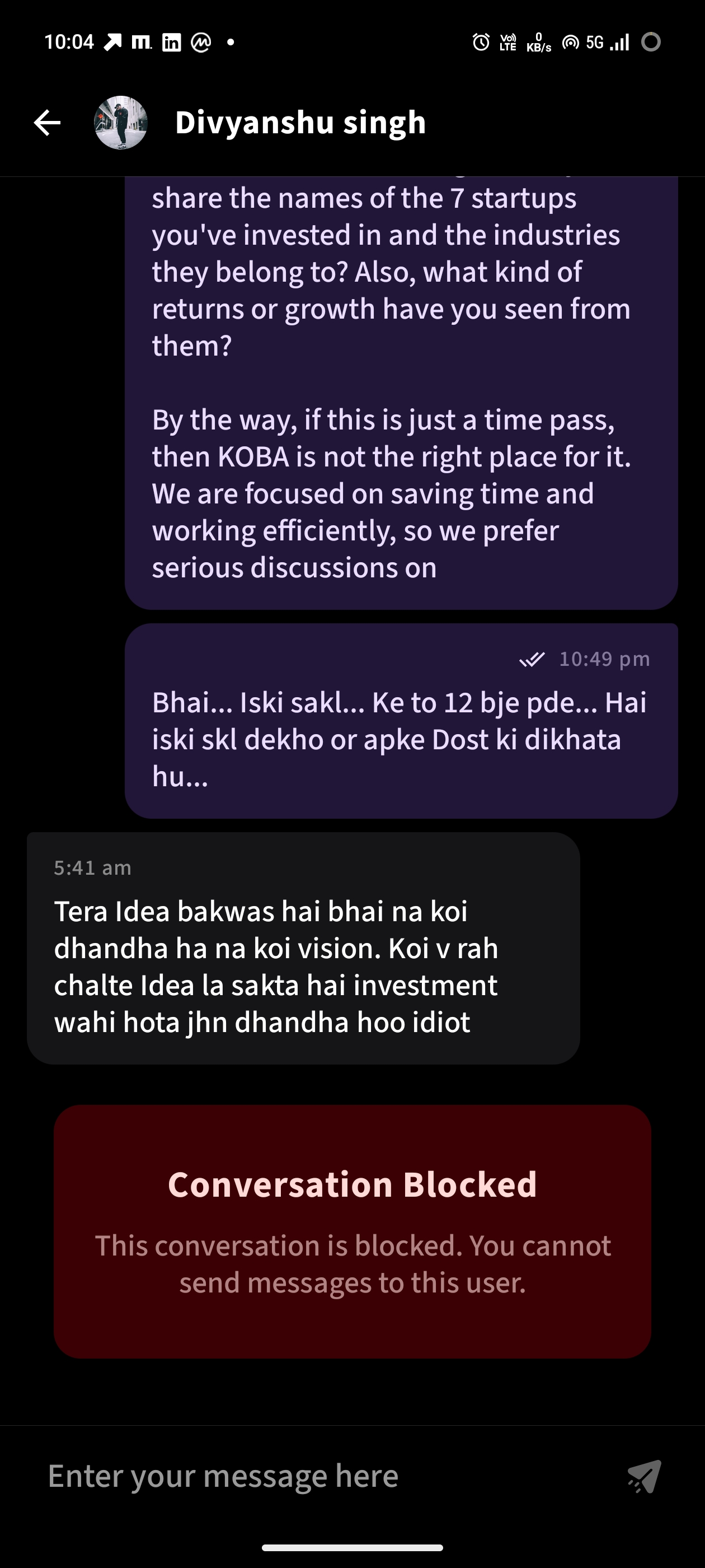 "Warning to all entrepreneurs and founders: Be cautious before sharing your business ideas with this person. I initially asked him about his past portfolio before discussing any investment, but instead of providing any proper response, he replied unprofessionally. When I pointed out that we prefer serious discussions and not time-pass, he immediately gave a rude reply and blocked me. This person has no real investments, no business background, and is known for taking others' ideas. If you're serious about your work, think twice before trusting him."