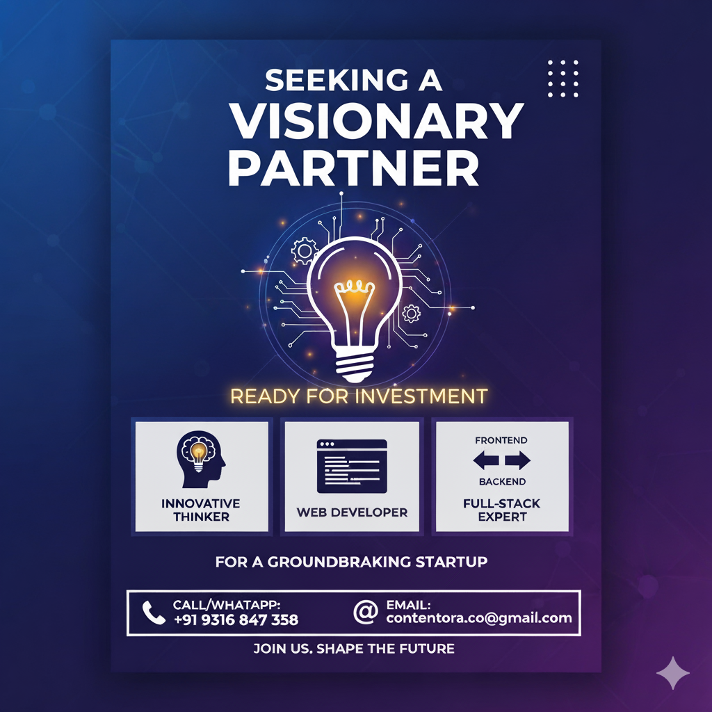 ๐ก Letโs Build the Next Big Thing! Iโm looking for a startup partner whoโs a creative web developer (frontend + backend) with a spark for innovation and growth. Ready to join a groundbreaking tech startup? ๐ DM / WhatsApp: +91 93168 47358 ๐ง conte