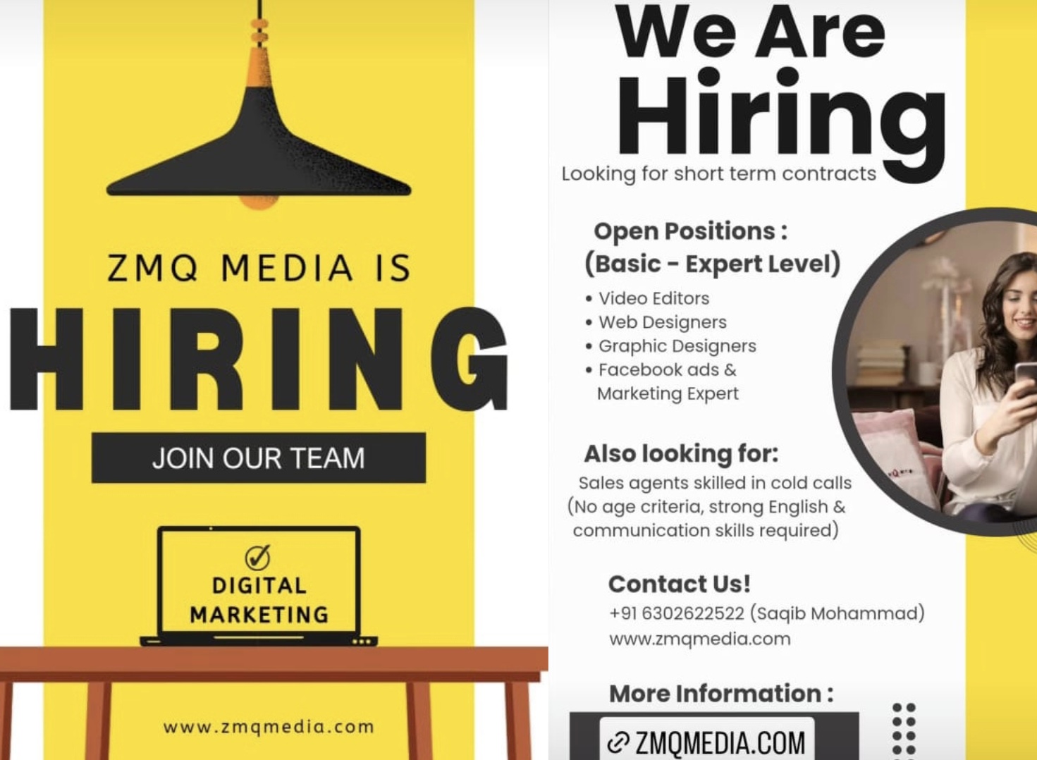 **Join the ZMQ Media Team!** We are actively hiring for the following positions: - Video Editors - Web Designers - Graphic Designers - Facebook Ads and Marketing Experts - Skilled Sales Agents (with expertise in cold calls) At ZMQ Media, we value talent over age. Strong English and exceptional communication skills are essential! **Contact Us:** Phone: 6302622522 (Saqib Mohammad) Website: www.zmqmedia.com For more details, check out our Instagram page: @zmqmedia Seize the opportunity to be part of our dynamic team!