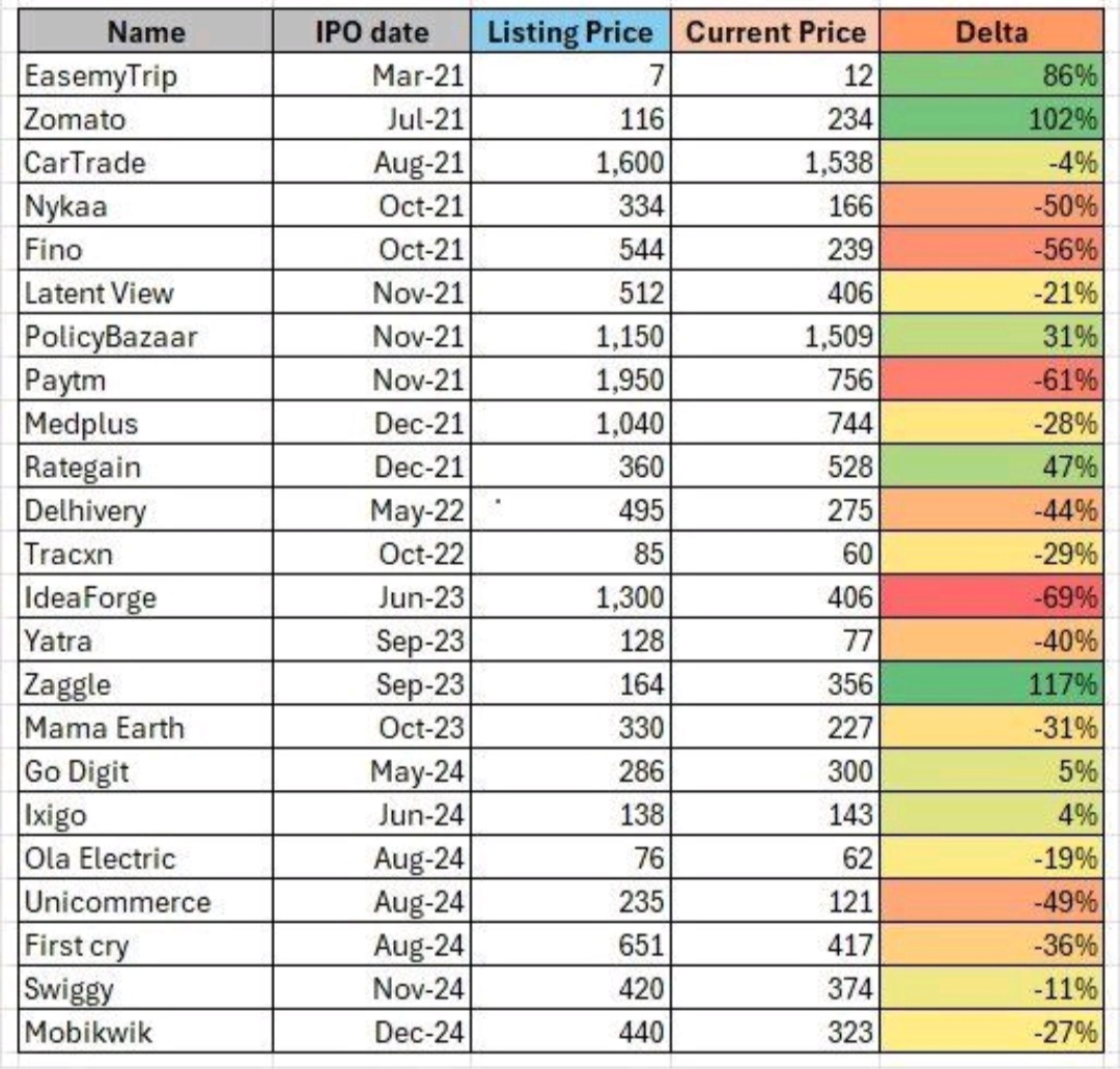 Hmm, So India is not yet ready for Startup IPOs with only 7 Startups giving a positive return on the listing day out of 23 Startups.