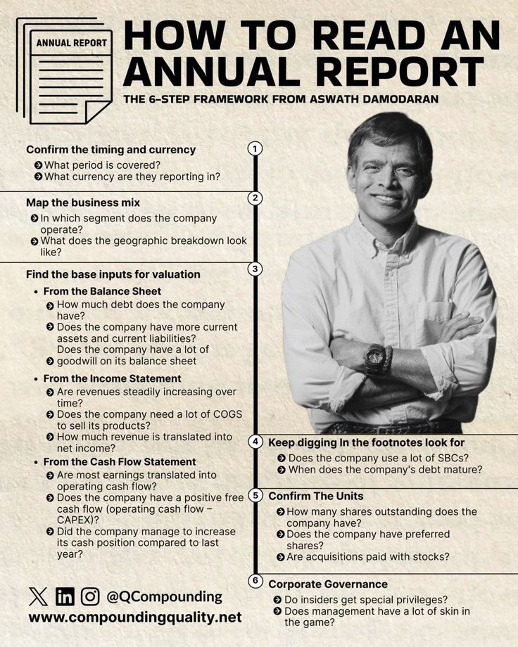 ๐ข How to Read an Annual Report Like a Pro! ๐ข Want to analyze a companyโs health but overwhelmed by annual reports? ๐ตโ๐ซ Donโt worry! Hereโs a 6-step framework from Aswath Damodaran to make it EASY! ๐ โ Check timing & currency โ What period is c