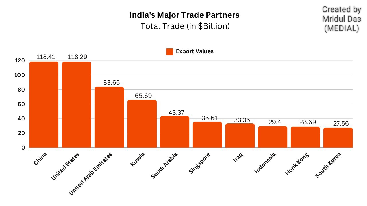 India's Major Trade Partners โ Total Trade (in $Billion). 1. China โ $118.41 Billion๐จ๐ณ but $100b deficit ๐ป๐ป 2. United States โ $118.29 Billion๐บ๐ฒ $47b Surplus ๐ฅ 3. United Arab Emirates โ $83.65 Billion๐ฆ๐ช 4. Russia โ $65.69 Billion๐ท๐บ 5.