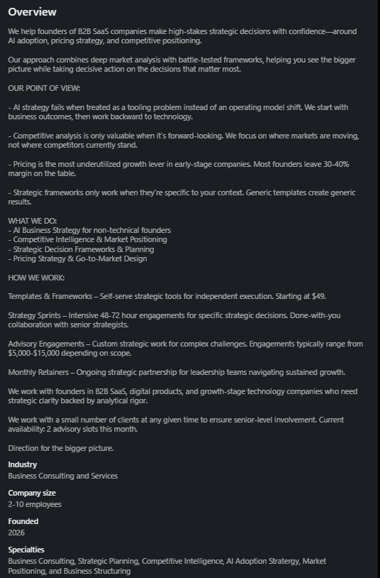 Hi Guys, Finally executing my startup after breaking the thinking trap. Built the profile - should I keep the 'established firm' look and gradually add real credentials, or go authentic solo founder from day 1? Feeling nervous about nailing this firs