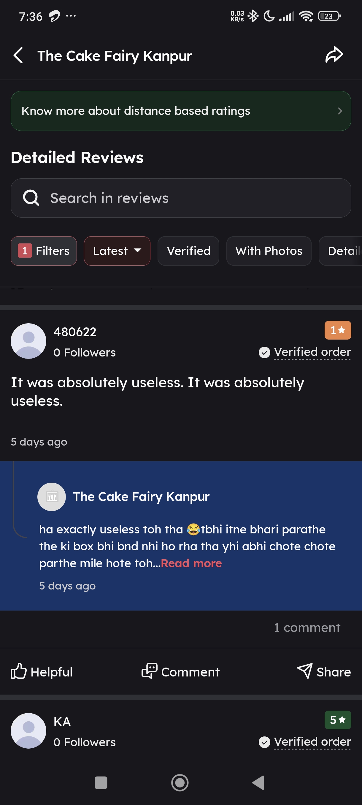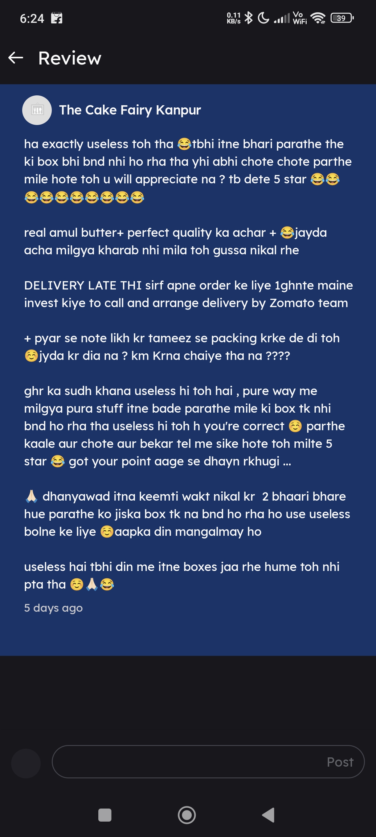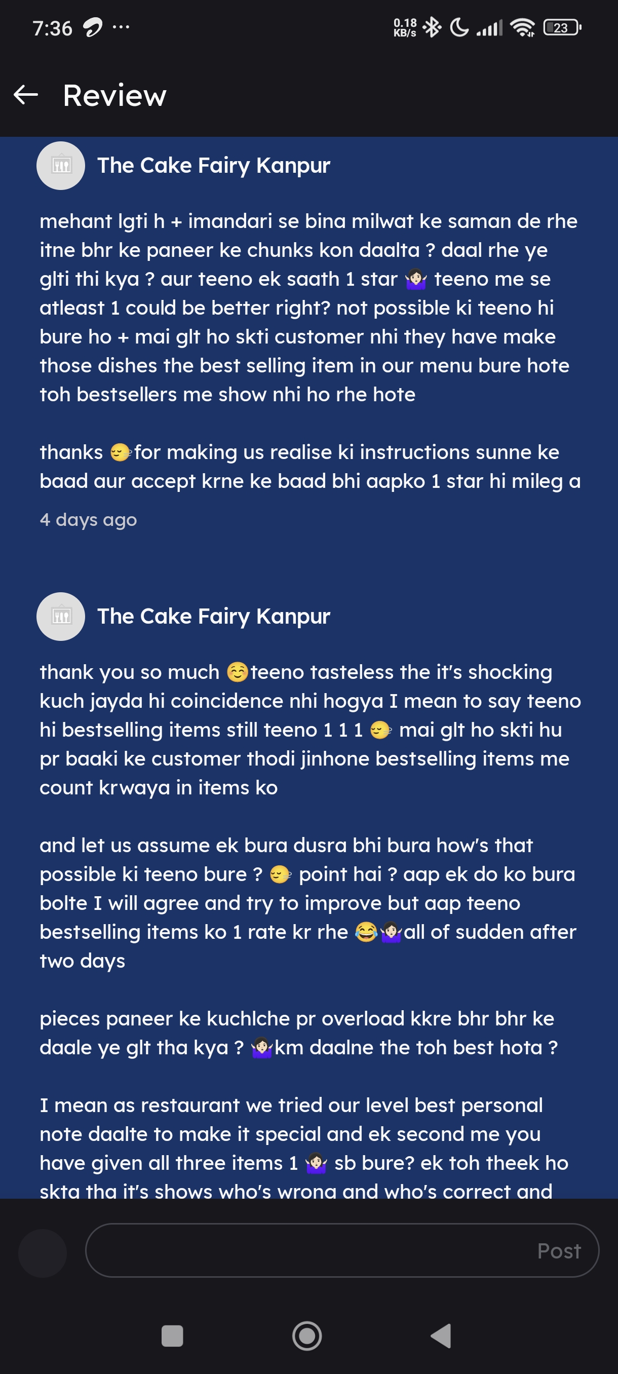 ๐ Seriously in kanpur one unique cloud kitchen called the cake fairy is literally giving aggressive reply to those customers who give 1 star โญ rating without any reason but personally i tried their item's and everything is really good but ๐ few peo