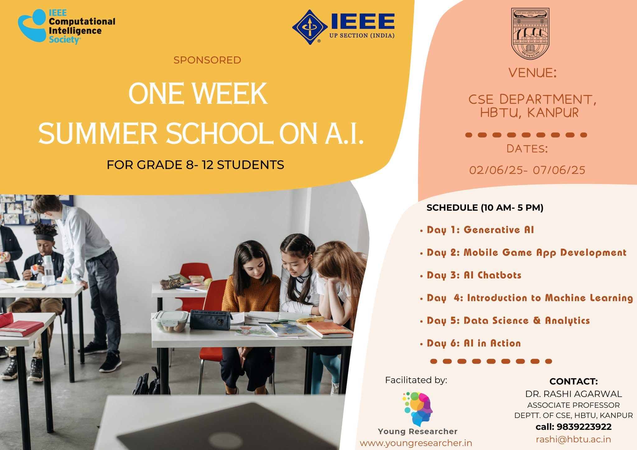 IEEE CIS (Computational Intelligence Society) and IEEE U.P. Section are sponsoring a "One Week Summer School on A.I." for all students from grade 8-12 from 02/06/25 to 07/06/25 (10 AM to 5 PM). The Department of CSE, HBTU, Kanpur with permission of