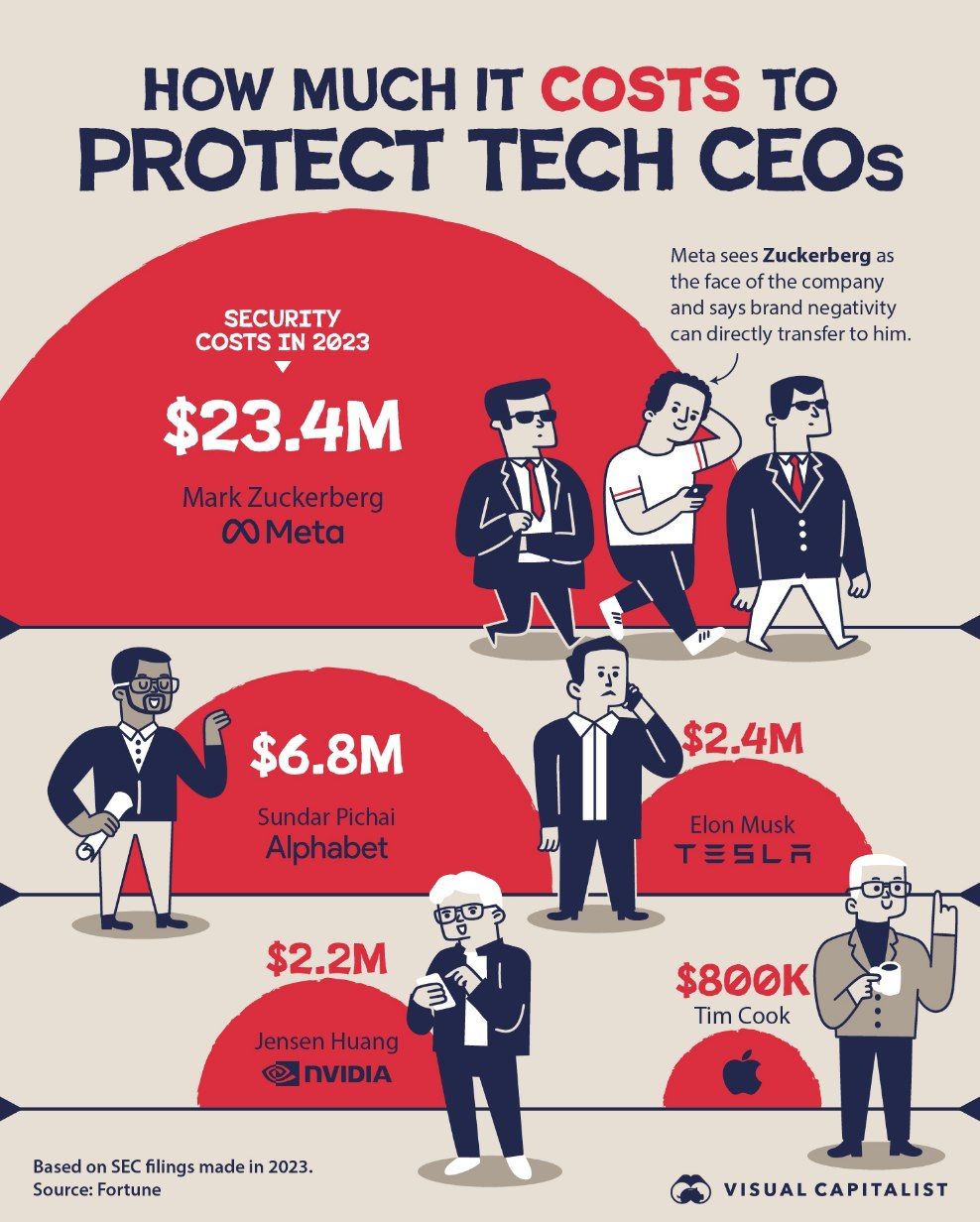 These are the Annual security costs incurred by Big Tech to protect their CEOs. What do these costs include?Everything from home monitoring to personal bodyguards and security consulting. Pay attention towards Zuck especially. Meta has paid the mos