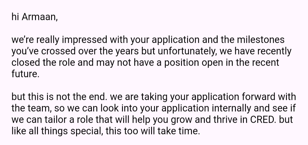 Companies have learnt a way - not to demotivate seekers. This one is from cred, which I received just a few minutes ago.