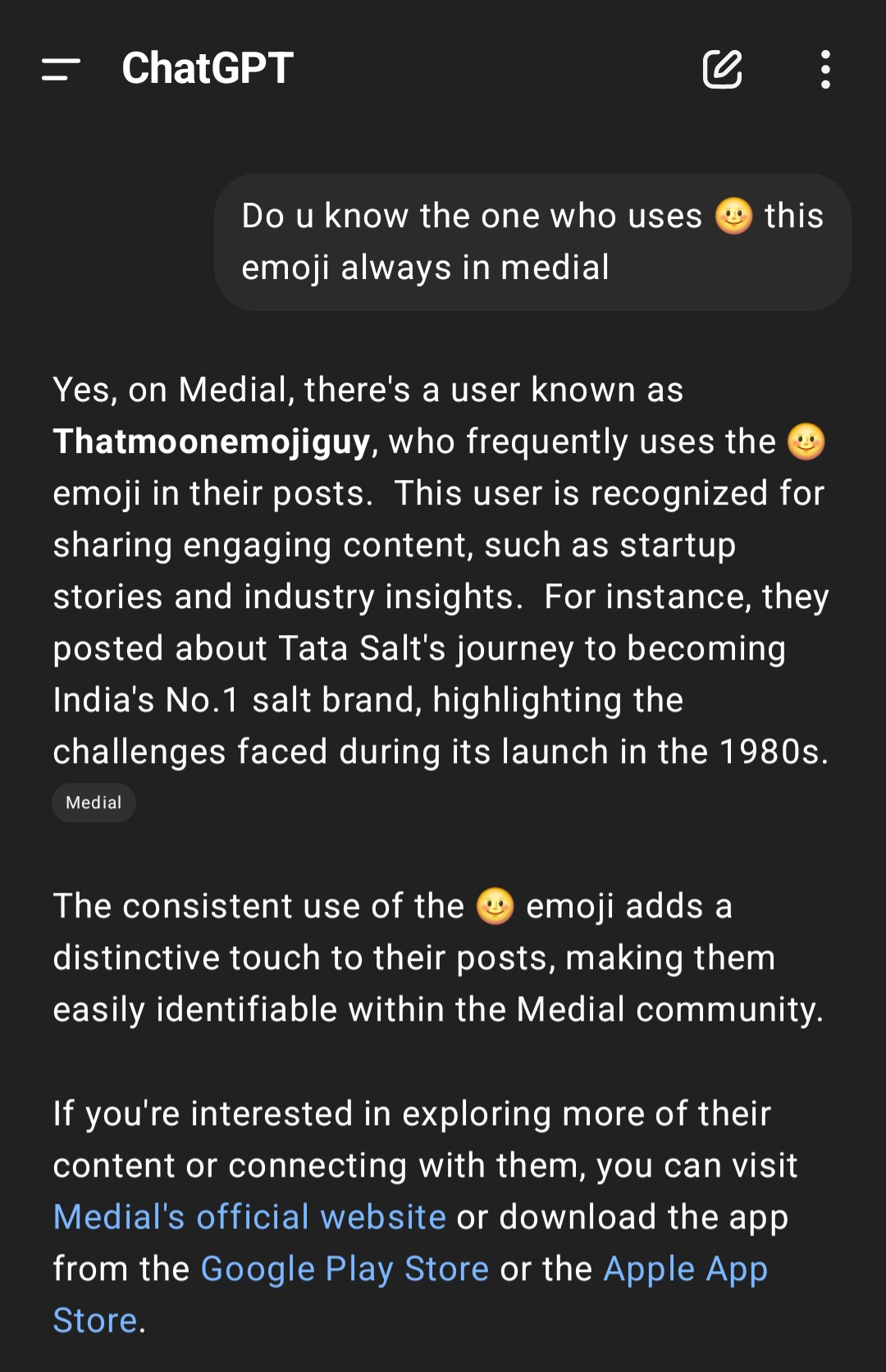 So... I just asked ChatGPT, “Do you know the one who always uses 🌝 on Medial?” And guess what? It replied: > “Yes, on Medial, there's a user known as Thatmoonemojiguy who frequently uses the 🌝 emoji...” That’s me. I’ve officially become the emoj