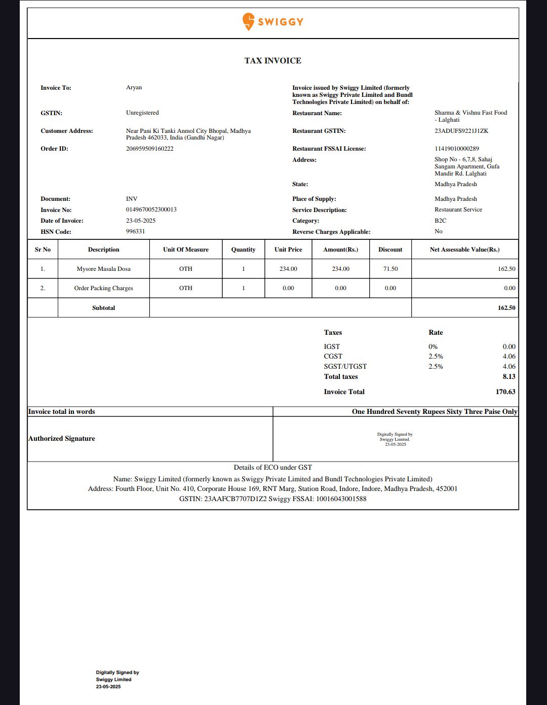 ๐จ Is Swiggy Overcharging You on GST? Checked my order (ID: 206959509160222) and found troubling gaps: โ Paid: โน124 โ Invoice: โน170.63 โ Discount mismatch: โน130 vs โน71.50 โ GST overcharged: โน8.13 instead of โน5.79 Under Sec 15 of CGST Act, tax must