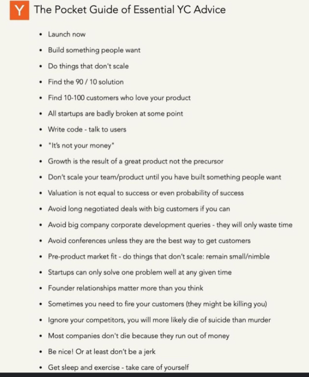 Y combinators advice to Young Founders- Launch quickly to gather feedback and iterate. Do unscalable tasks initially for deep market understanding. Focus on achieving 90% results with 10% effort. Prioritize coding and user interaction, avoiding di