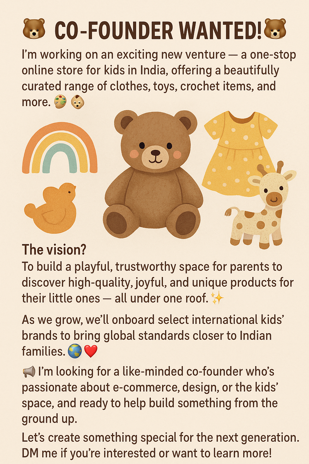๐ Co-Founder Wanted! ๐งธ Iโm building a one-stop online store for kids in Indiaโclothes, toys, crochet, and moreโcurated with love and quality. Looking for a like-minded co-founder whoโs passionate about e-commerce, kidsโ products, or design. Letโ