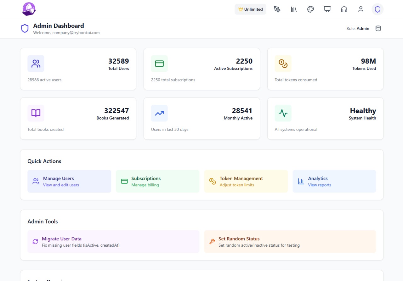 ๐ Milestone Unlocked! Weโre proud to share a behind-the-scenes look at the TryBook AI Admin Dashboard โ where innovation meets scale! ๐ Over 322,000+ books generated ๐ฅ 32,000+ total users ๐ณ 2,250+ active subscriptions ๐ 98M+ tokens processed ๐ก