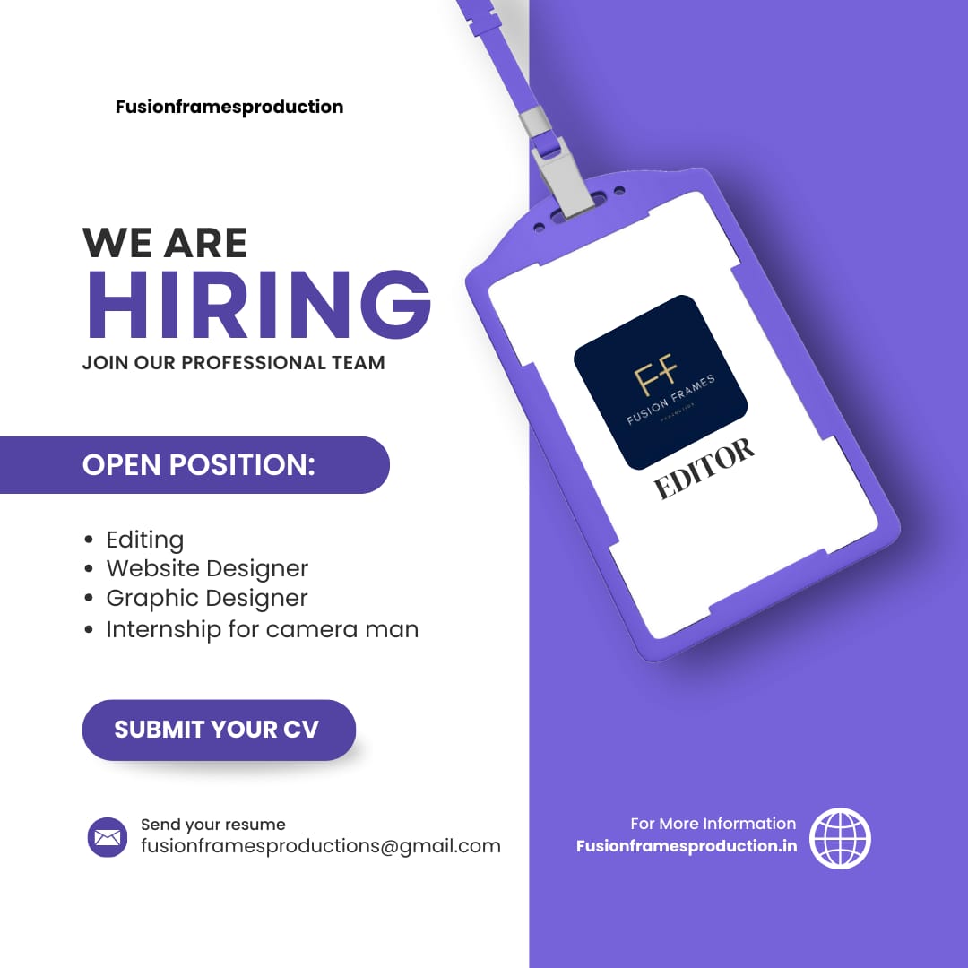 🚨 We’re Hiring! Video Editor Wanted – 1 Vacancy 🚨 Fusion Frames Production is looking for a talented and creative Video Editor to join our team! If you have a passion for storytelling, cinematic editing, and creating high-quality visuals, this is