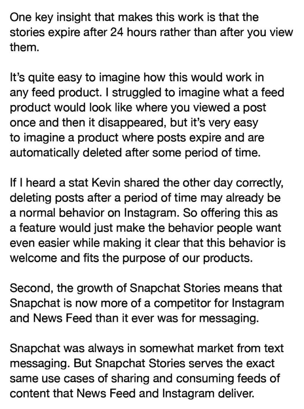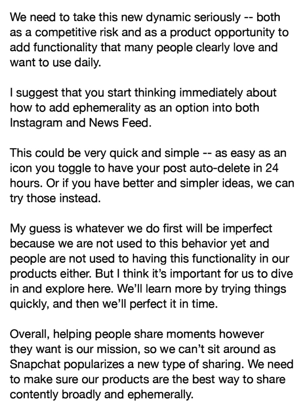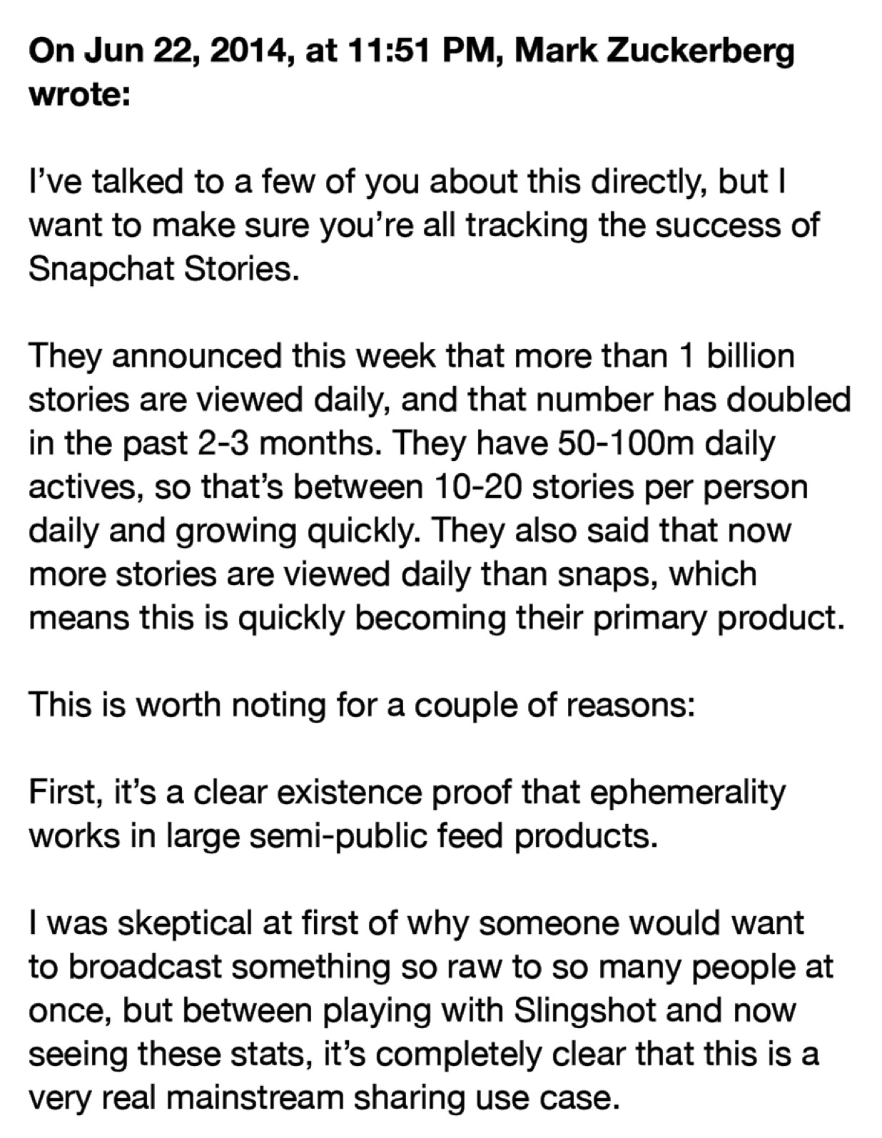 Mark Zuckerberg: We need to take Snapchat Stories seriously Zuckโs internmal memos are master classes on how to think about product and strategise things. Sometimes copying something that works into your product is not a bad idea or to be debate aro