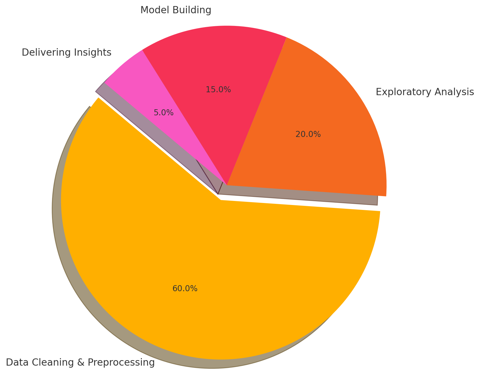 ๐ Data Science Reality Check! Ever tracked how much time you actually spend on: โณ 60% Data cleaning & preprocessing ๐ 20% Exploratory analysis ๐ค 15% Model building ๐ก 5% Delivering insights The hard truth: We spend 12x more time preparing data t