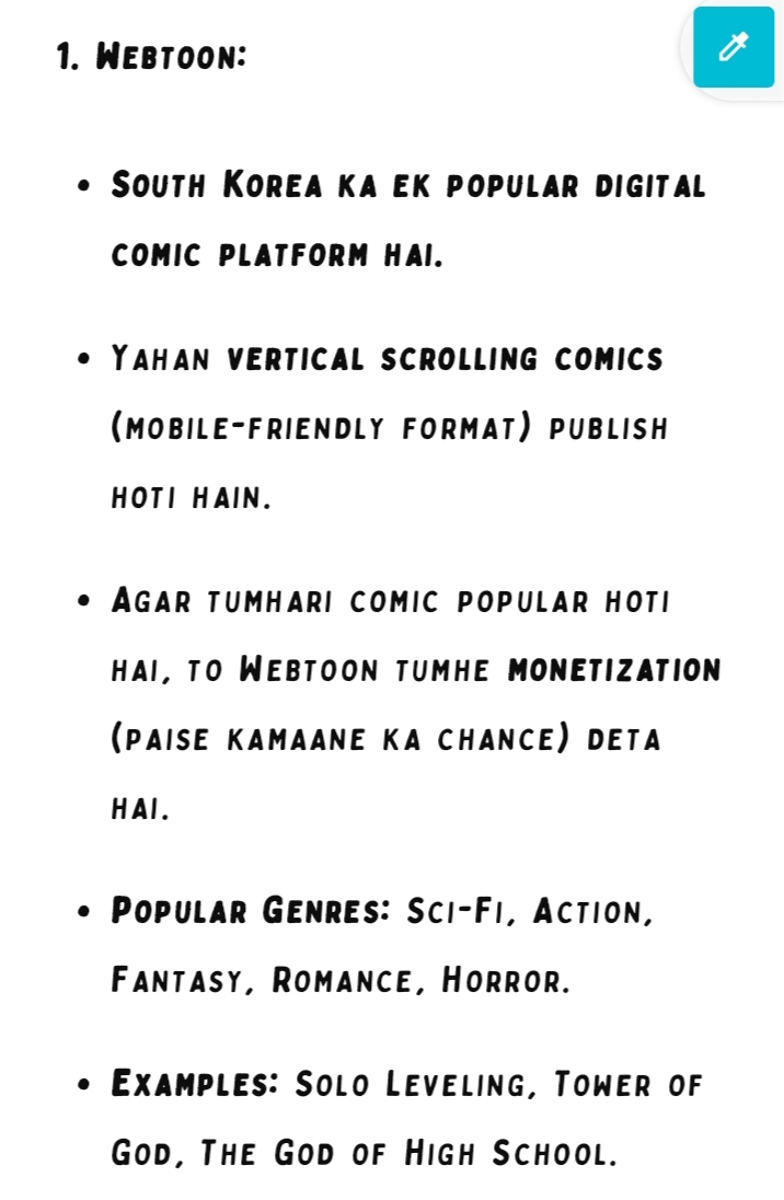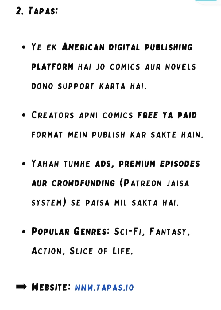 hello everyone mujhe 2 bahut hi shaandar application mili hai jin par aap apni stories, comic book , script writing or story writing kar sakte hai or publish karke achha paisa kama sakte hai pahli application hai 1. webtoon. or second hai 2. tapas. to jo koi bhi apni stories or comics share karke paise kamana chahe to in application ko download kare ye koi promotion nhi hai bas information hai jo bilkul correct hai thanks 👍👍