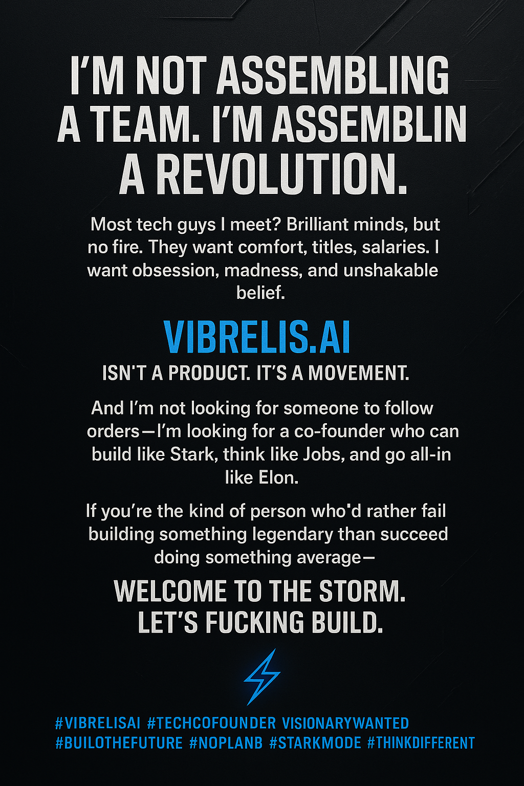 I’m not building a startup for employees. I’m building a fking legacy.** Met some tech folks lately—smart, but soulless. They wait for instructions. I’m not here to babysit, I’m here to build empires. Vibrelis.AI isn’t a side project. It’s war. I ne