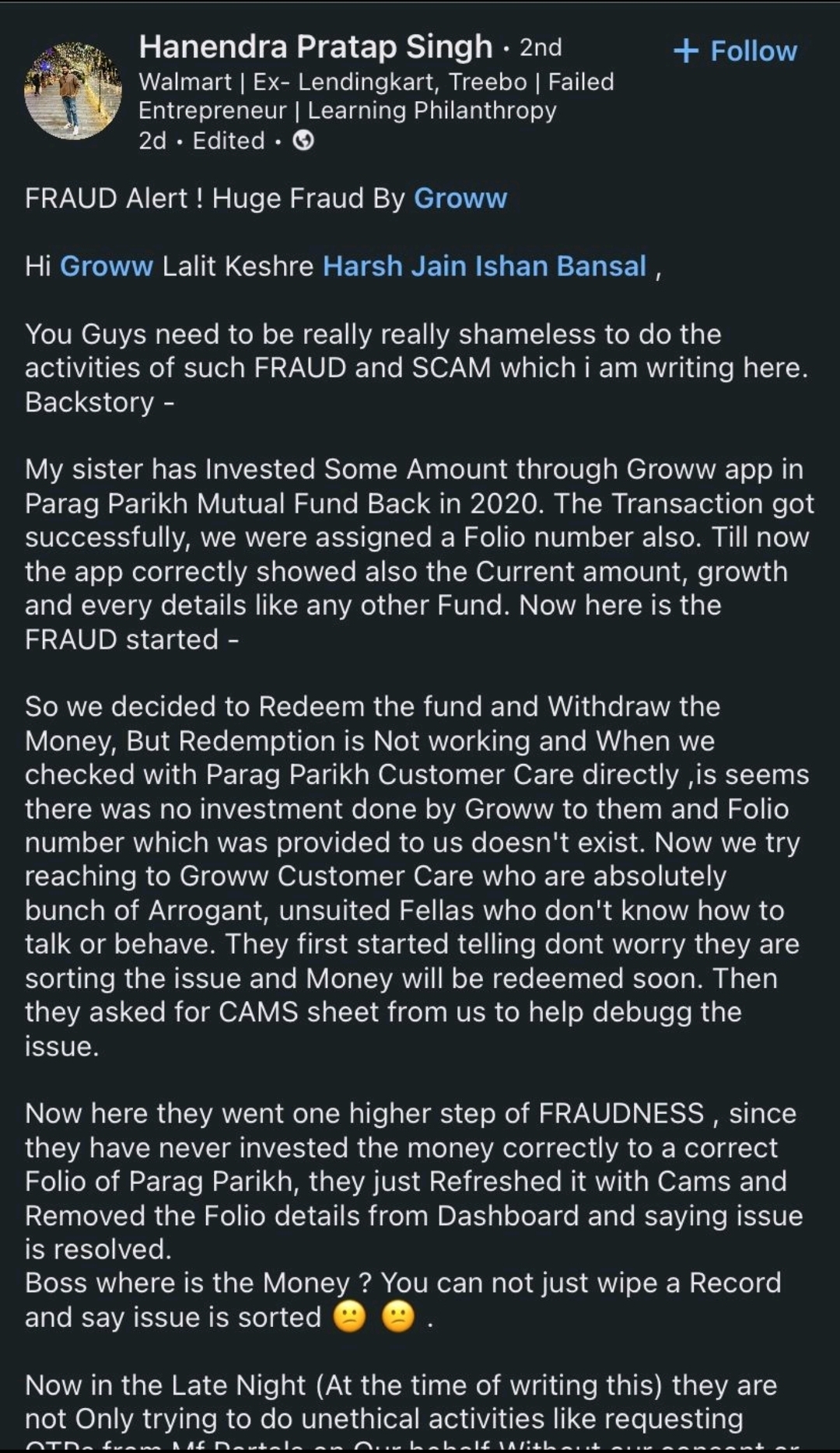 Groww just made a mess! Instead of investing the money apparently they created a fake folio! This is scary. And worst of all, it is alleged that instead of issuing an apology, they are demanding the post to be deleted. Did this give the necessary n