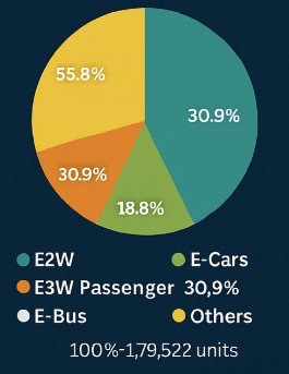 India Registers 1.79 Lakh EVs in May 2025; E2Ws Dominate Sales Surge Indiaโs EV sector continues its upward trajectory with 1,79,522 electric vehicles sold in May 2025. Electric two-wheelers (E2Ws) led the charge with over 1 lakh units sold, domina