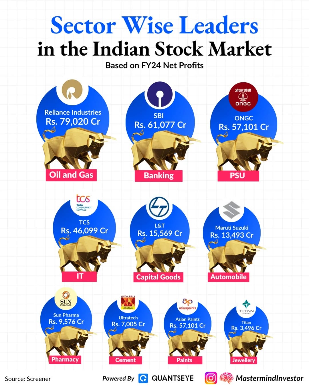 Sector-Wise Leaders of FY24! ๐๐ Whoโs ruling the Indian stock market? Here are the biggest profit-makers across industries! ๐ฅ๐ฐ ๐น Oil & Gas โ Reliance Industries ๐ต โน79,020 Cr ๐น Banking โ SBI ๐ฆ โน61,077 Cr ๐น PSU โ ONGC โฝ โน57,101 Cr ๐น IT โ