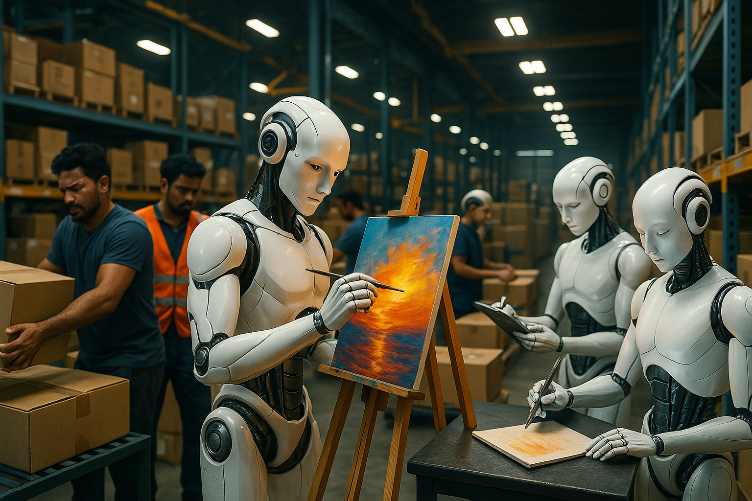 ๐ฆ๐ผ๐บ๐ฒ๐๐ต๐ถ๐ป๐ด ๐๐๐ฟ๐ฎ๐ป๐ด๐ฒ ๐ถ๐ ๐ต๐ฎ๐ฝ๐ฝ๐ฒ๐ป๐ถ๐ป๐ด. People are still doing hard physical work They're delivering packages, working in warehouses, lifting heavy stuff. Meanwhile, AI is busy doing creative things โ writing poems, making art,