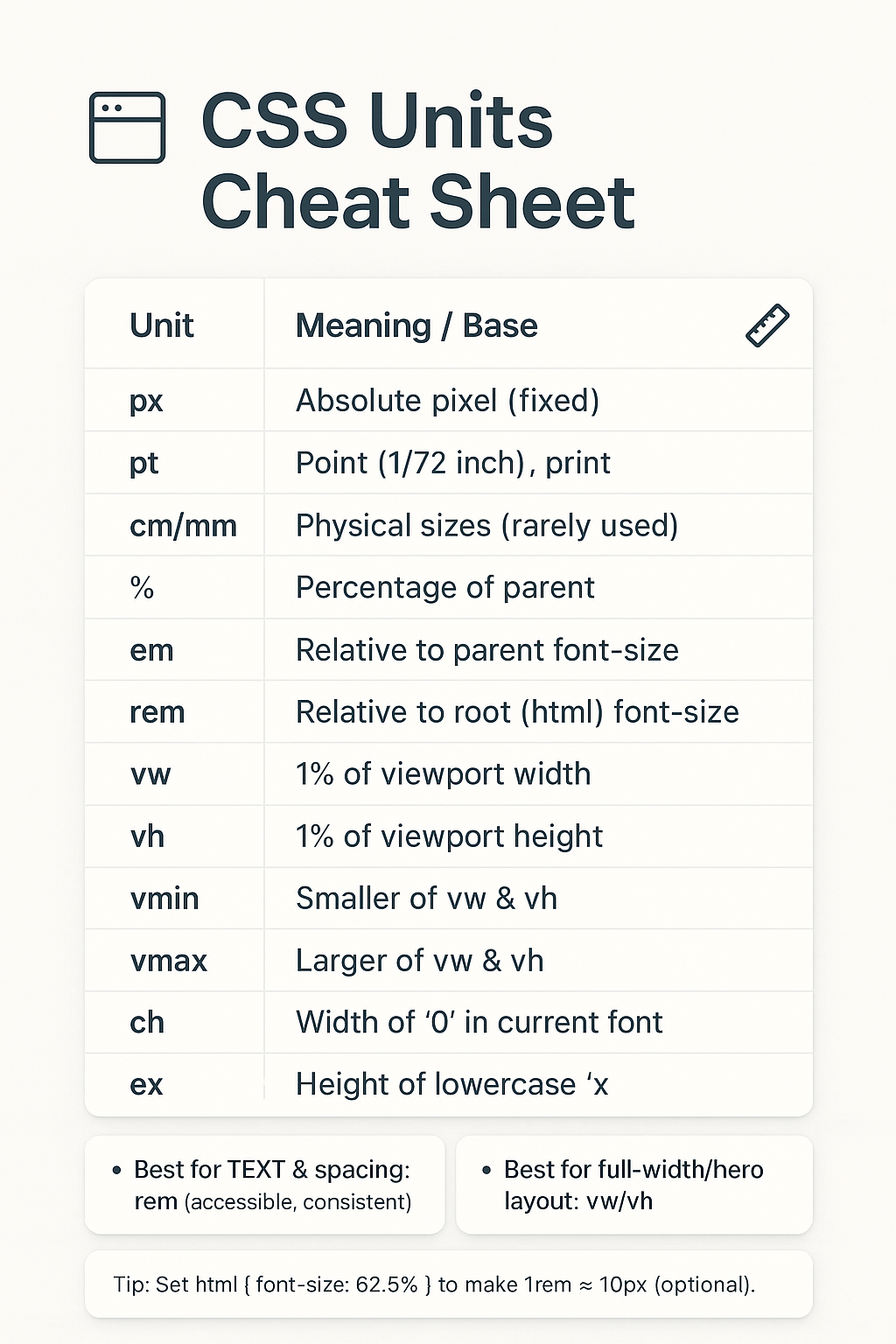 ๐ปโจ CSS Units Simplified! ๐น px โ fixed pixels (precise control) ๐น % โ relative to parent element ๐น em โ relative to parentโs font-size ๐น rem โ relative to root font-size ๐น vh/vw โ relative to viewport height/width ๐น fr โ flexible grid space โก