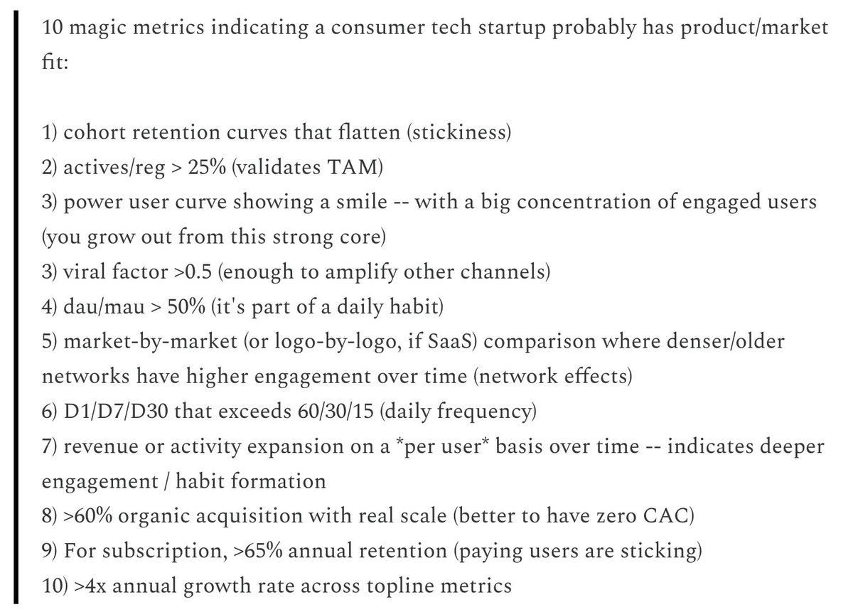 10 magic metrics indicating a consumer tech startup probably has product/market fit: This is one of the best lists I have found on the internet. And no surprise, its from Andrew Chen. "Of course, hitting these metrics is hard. Very hard. But itโs