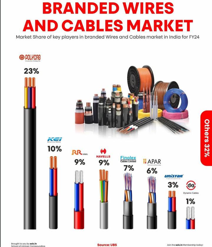 With the announcements of entry of Ultratech and Adani into this sector all eyes are on the Wires and Cables Market Branded Wires and Cables Market in India was estimated to be around Rs 64,000 crores in FY24. It is expected to grow around 13%-14% CAGR till FY30 as per UBS. Here is a graphic showing the market share of key players in the Wires and Cables Market in India (for FY24). Will the entry of Adani and Ultratech hurt the existing players badly? 🤞