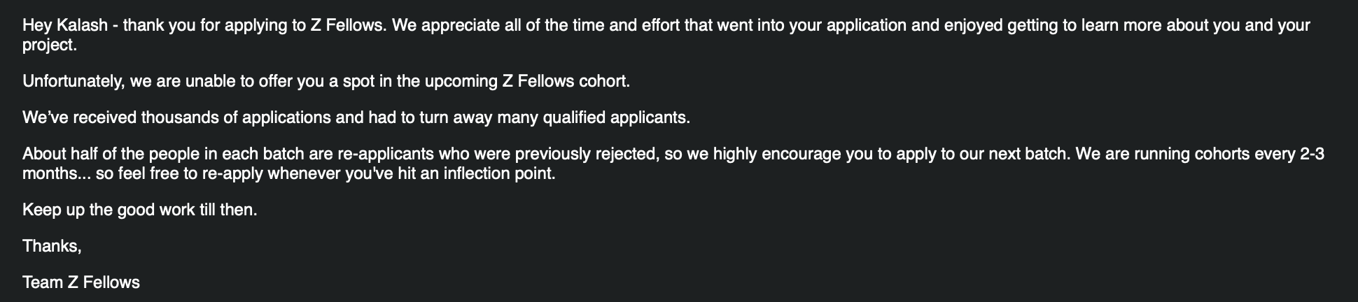 Got rejected again from Z-Fellow & Y-Combinator. Just when I thought I was on the right track, life decides to hit me with a plot twist. Time to dust off my ego and keep pushing! Who's with me?