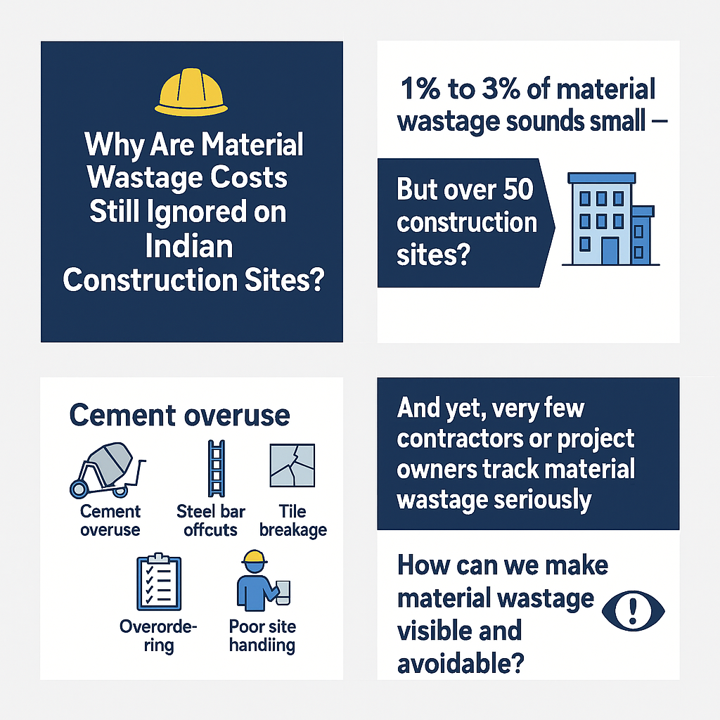 ๐ โWhy Are Material Wastage Costs Still Ignored on Indian Construction Sites?โ > ๐ง 1% to 3% of material wastage sounds smallโ But over 50 construction sites? Thatโs lakhs of rupees lost in: Cement overuse Steel bar offcuts Tile breakage Ove